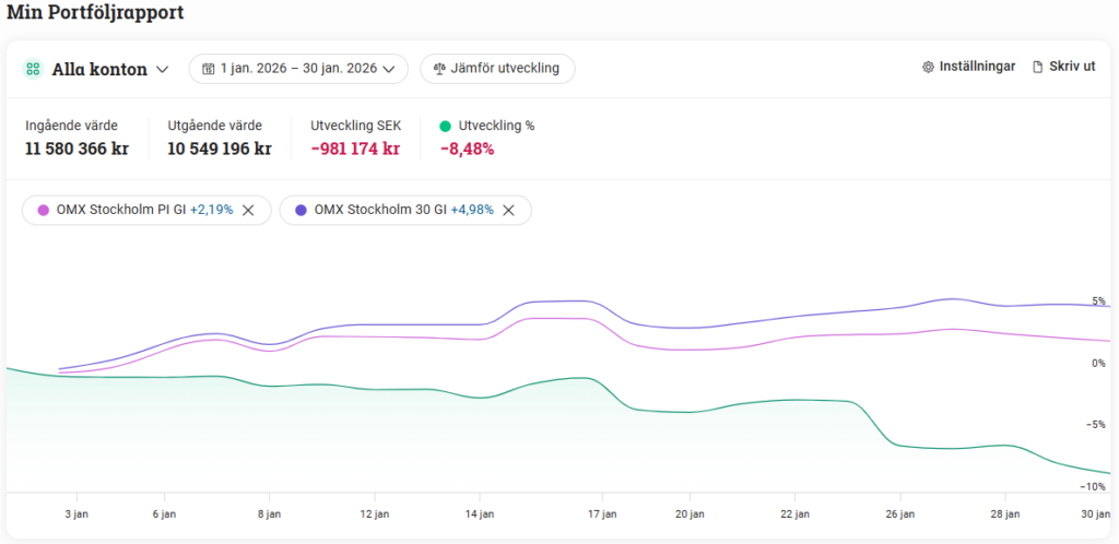 Total utveckling 2026: -8,48 % (-981 174 kr)